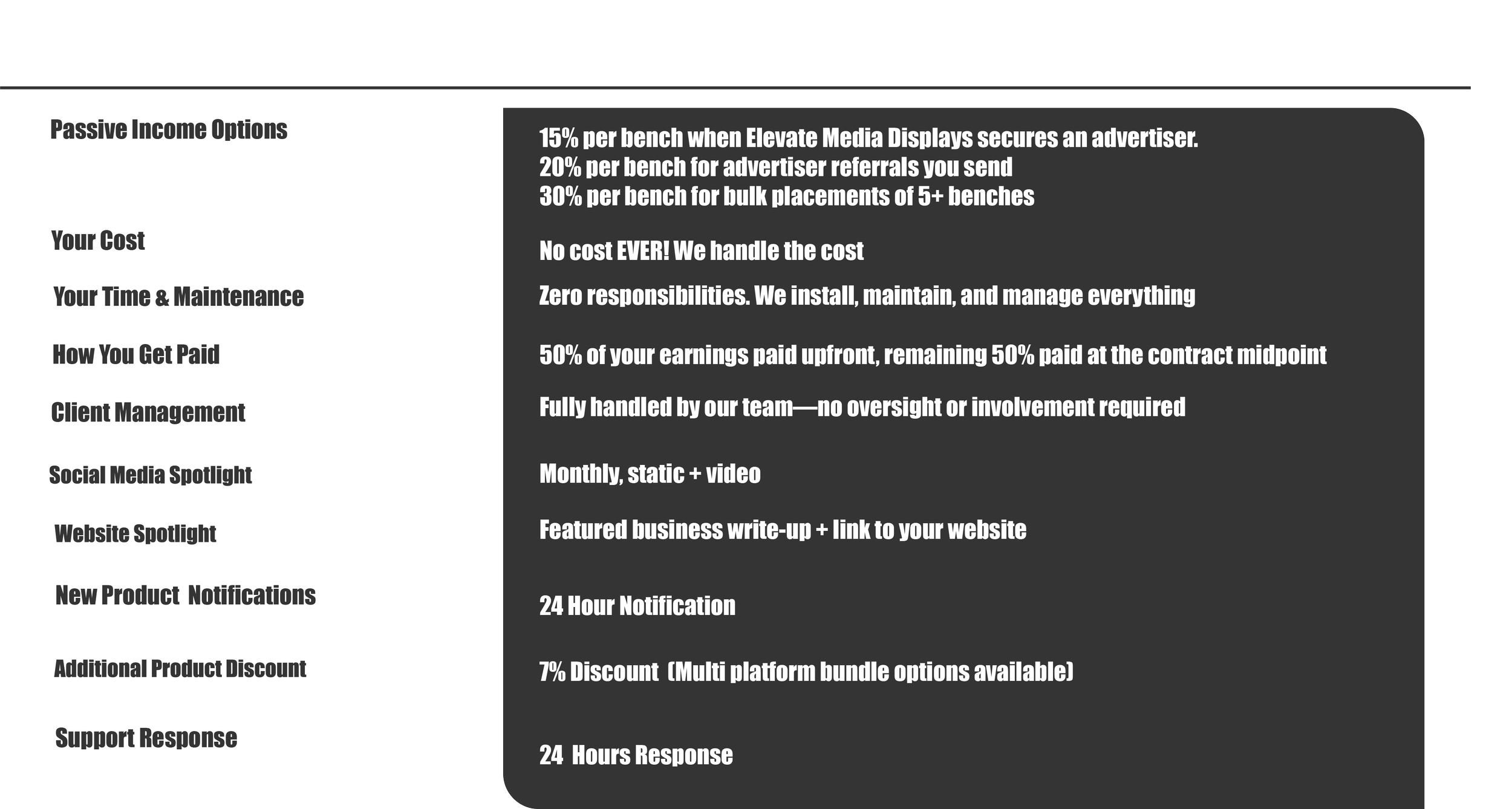 Got a lobby, storefront, or high-traffic area that could use an upgrade? Elevate Media Displays can turn it into a sleek, eco-friendly bench billboard — and pay you every month for letting local businesses advertise there.